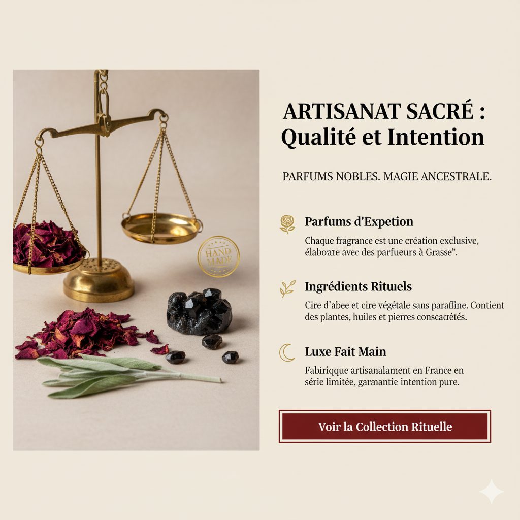Les parfums sont sans CMR lorsque possible, les herbes sont purifiées, et les pierres énergétiquement nettoyées avant l’intégration.